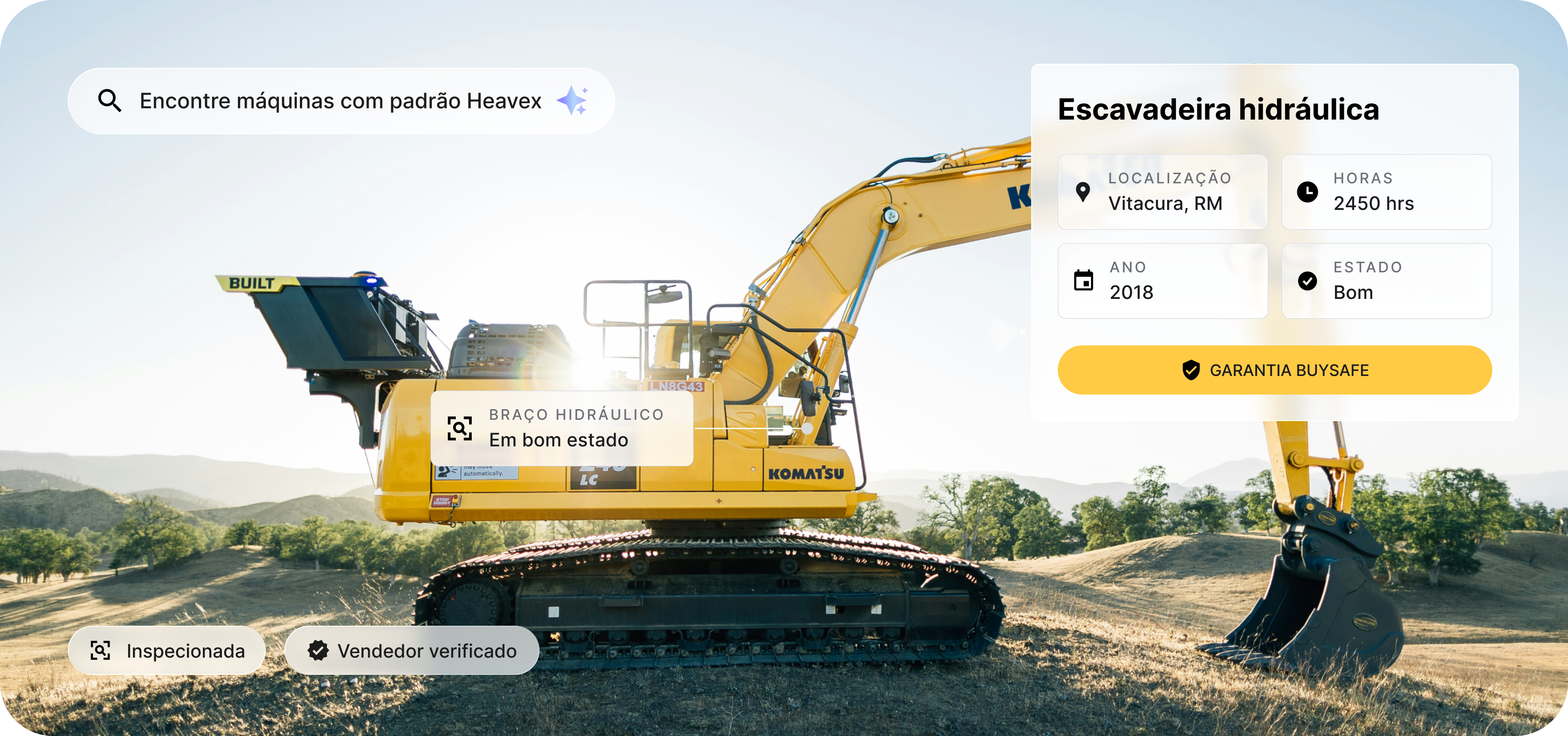 Inspectores independentes realizam uma avaliação em terreno com provas operativas, fotos em HD e um informe técnico completo. O relatório descarregável mostra a classificação da máquina e observações detalhadas, para que compre com total transparência.